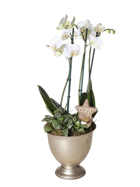 Valkoinen perhoskämmekkä tyylikkäässä ruukussa. Ruukun ulkonäkö vaihtelee. Kauniisti koristeltu. Vit brudorkide planterad i en vacker kruka. Stilfullt dekorerad. Krukan varierar. #Kauppiaan suosikit